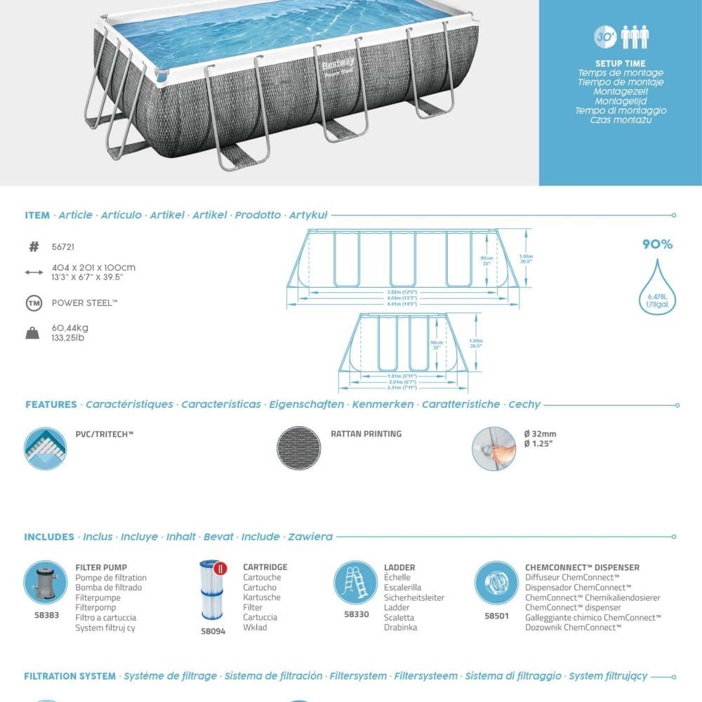 The Bestway model 56721 offers a perfect blend of simplicity and enjoyment, ideal for transforming any backyard into a refreshing oasis. With Bestway's hallmark of quality, this Power Steel pool promises easy setup and endless fun. Its design is both lightweight and spacious, inviting you to explore more of its technical features and consider making it the centerpiece of your summer leisure activities.