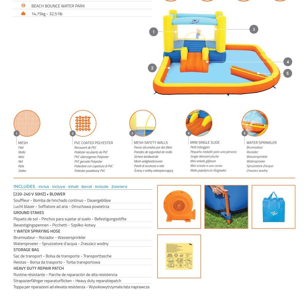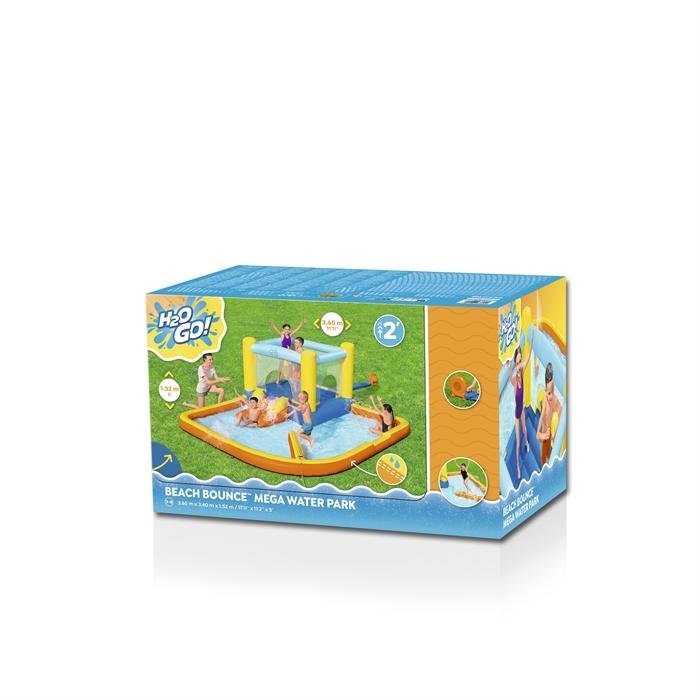 Ready, set, splash! Race the day away with the H2OGO!® Super Speedway™ Mega Water Park. From start to finish, this giant inflatable park brings the racetrack to your backyard. The double climbing wall leads to 2 curved slides, which have a spontaneous dump bucket at the top that will randomly soak the kids as they race. At the bottom of the slide, there is a giant splash pool with 2 point ‘n spray water blasters. Plus, there are even more games for kids to play – a ball hoop with a basketball and a tunnel to adventure through. Kids will be racing and playing in no time, because the included blower inflates this entire giant water park in just 2 minutes! The park is constructed of double-stitched, PVC-coated polyester material that is super durable and provides a comfortable feel and touch for kids, keeping the fun splashing year after year. Kids can splash and race their way through summer with the H2OGO! Super Speedway Inflatable Water Park!