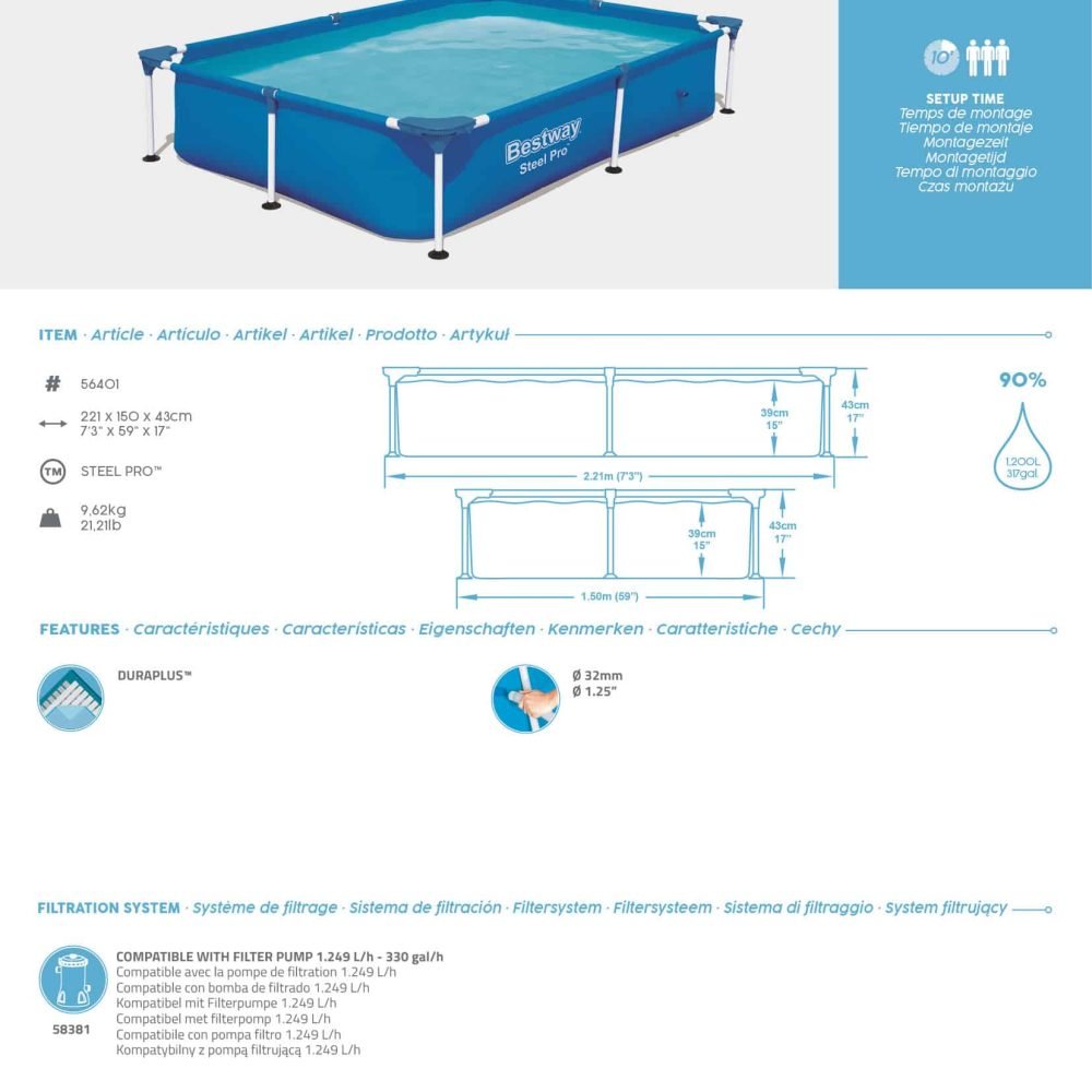 Introducing the Bestway 7.3 X 4.9 Metal Frame Swimming Pool 56401, a versatile and family-friendly option for cooling off and splashing around during the hot summer months. This Metal Frame pool boasts a generous size of 7.3 in Length and 1.30 in height, providing ample space for Construction, Kids, Pre School, Roof Top to enjoy. Crafted from durable materials, this pool is built to withstand regular use and offers long-lasting durability.