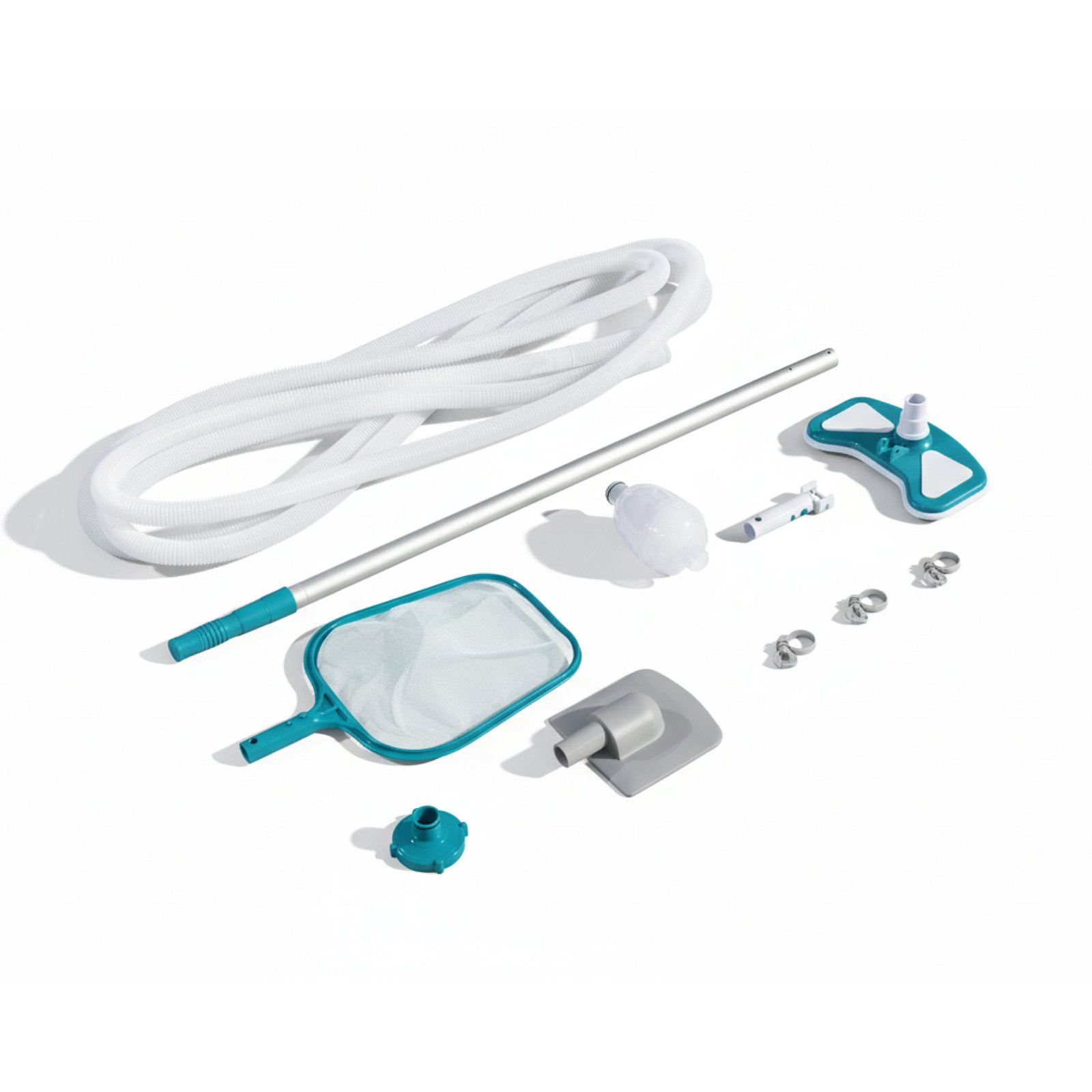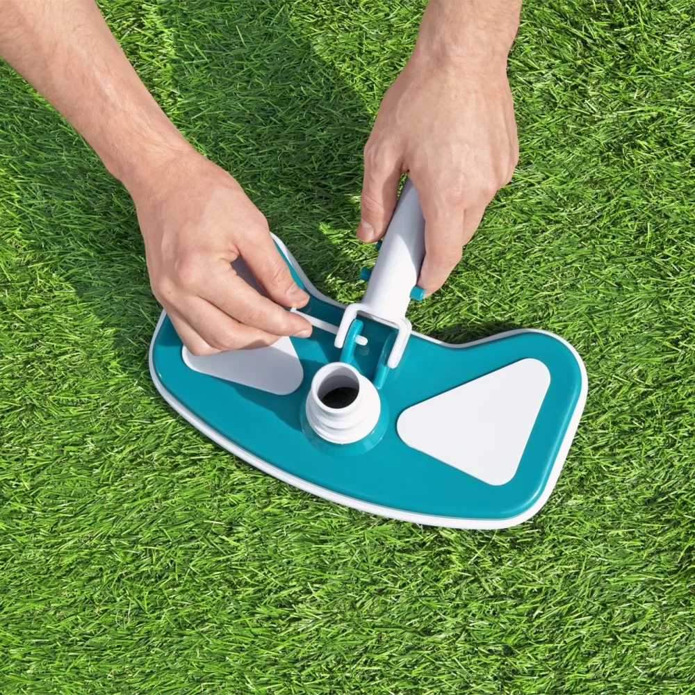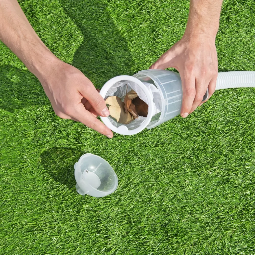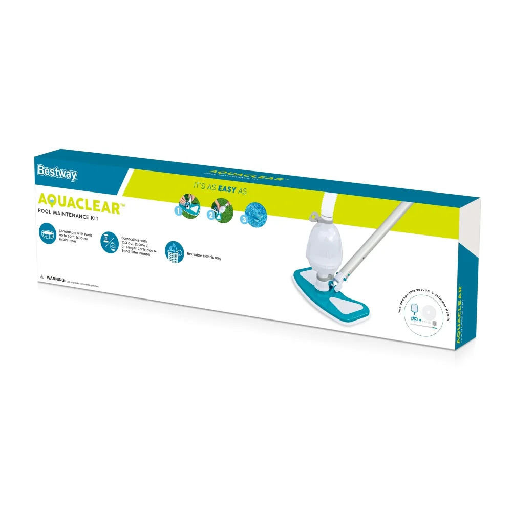The Bestway® AquaClean™ Pool Maintenance Kit has everything you need to clean the debris out of your pool. This set includes a lightweight pole with interchangeable vacuum and skimmer heads. The skimmer will scoop up leaves while the vacuum will suck up algae, debris and grime. Connecting the different heads to the pole is easy, no tools required! Using the included hose, simply attach the vacuum to your filter pump for suction and easily clear away the debris from the bottom of your pool into the reusable debris bag. The maintenance kit is compatible with filter pumps with 530 gal./h (2,006 L/h) flow rate or higher, and is great for use with above ground pools up to 20 ft. (6.10 m) in diameter. Plus, the kit even includes an adapter to be used with skimmer style filter pumps. The Bestway AquaClean Pool Maintenance Kit has everything you need to make cleaning the debris out of your pool a breeze!