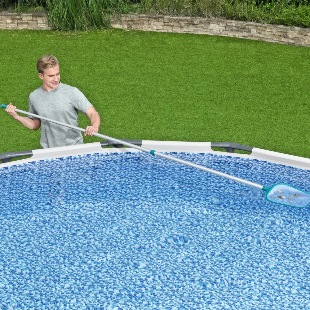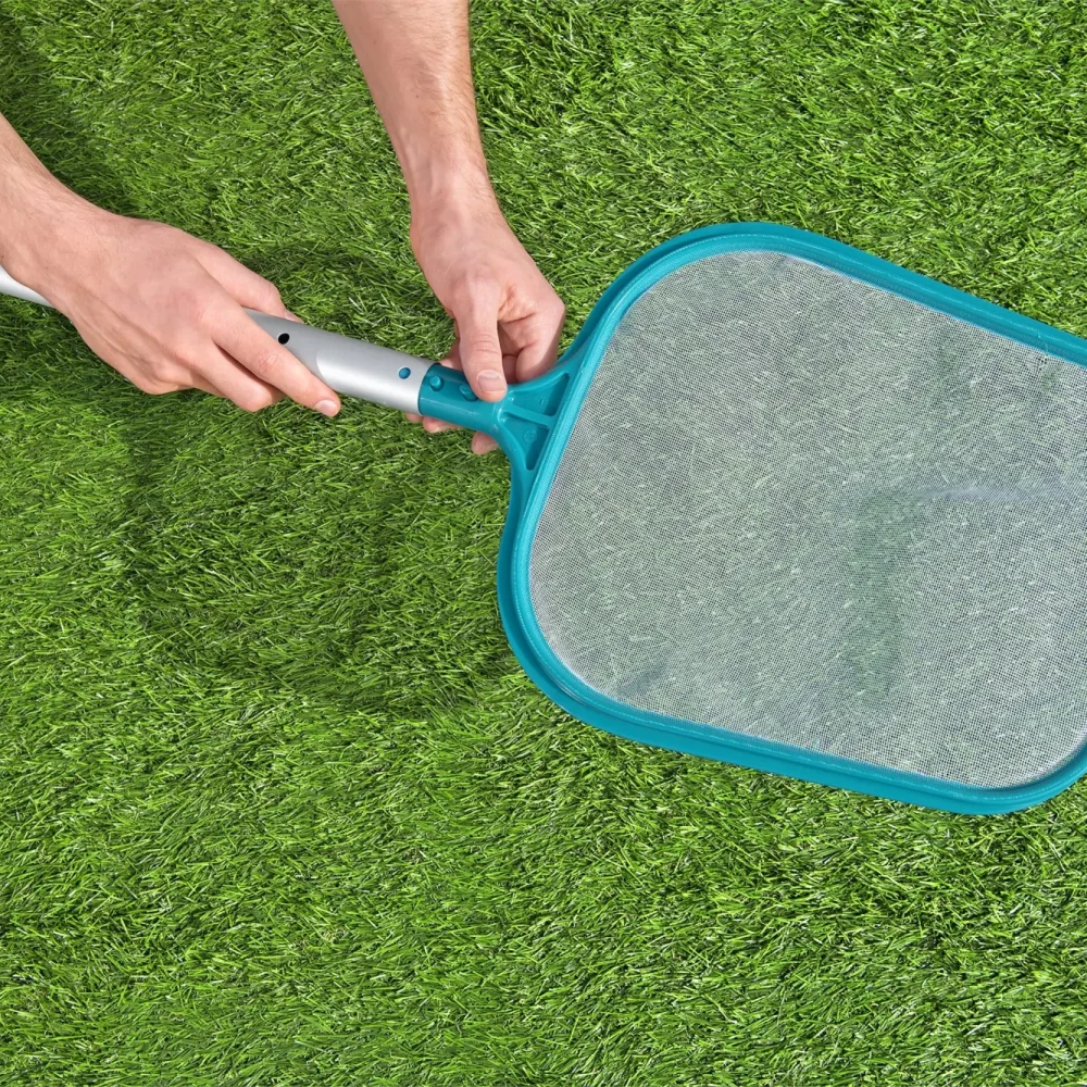 Keep the water clean and safe by regularly using a pool skimmer to remove debris and maintaining proper chemical balance to prevent algae and bacteria growth.