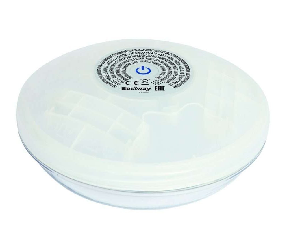 Bestway 58419. Product type: Pool light transformer, Product colour: White, International Protection (IP) code: IP68. Power source type: Battery, Battery type: AA. Weight: 337 g. Package type: Box, Package width: 205 mm, Package depth: 205 mm. Minimum order quantity: 1 pc(s), Products per pallet: 288 pc(s)