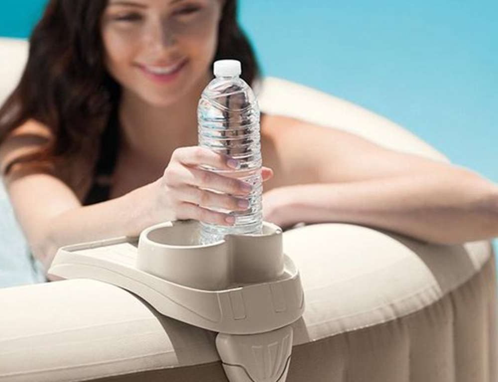 The PureSpa cup holder and refreshment tray is designed to securely attach to the spa wall. Keeps beverages and snacks close by while you relax. Removable for convenience. Holds 2 standard size beverage containers. Dimensions: 10.25in L X 8.63in W X 7in H